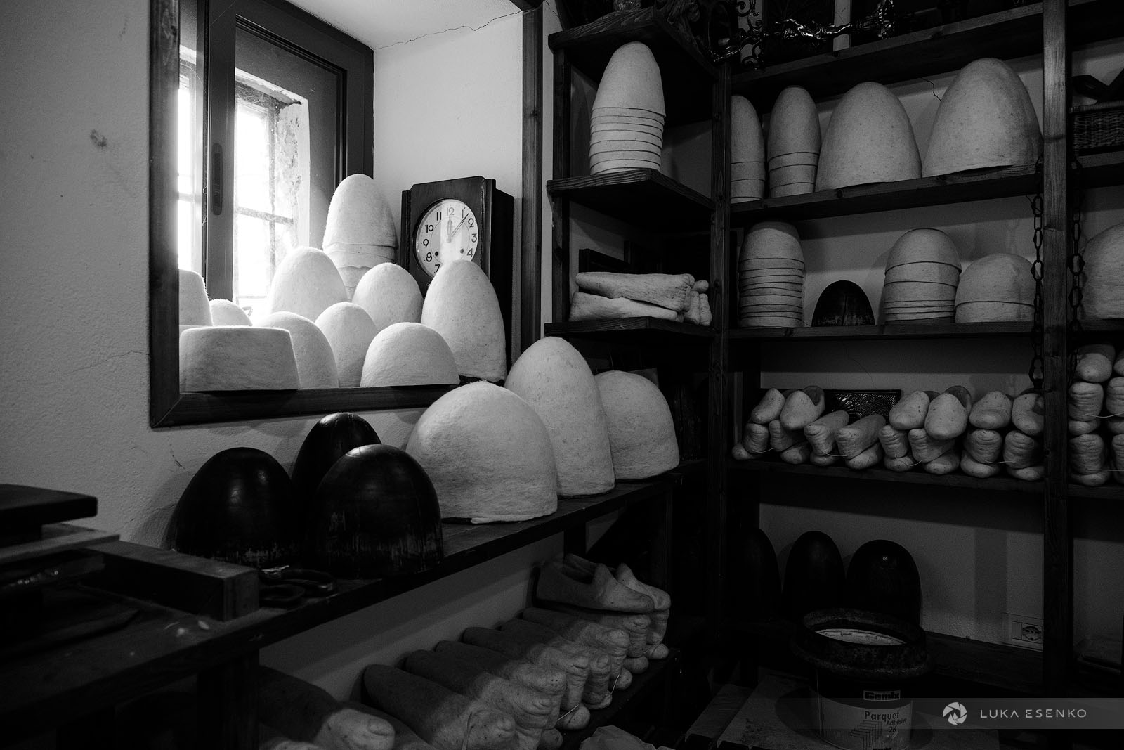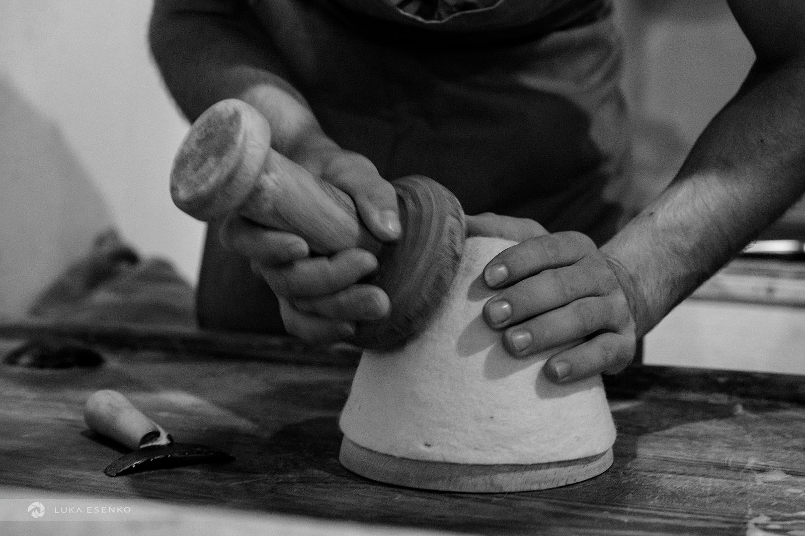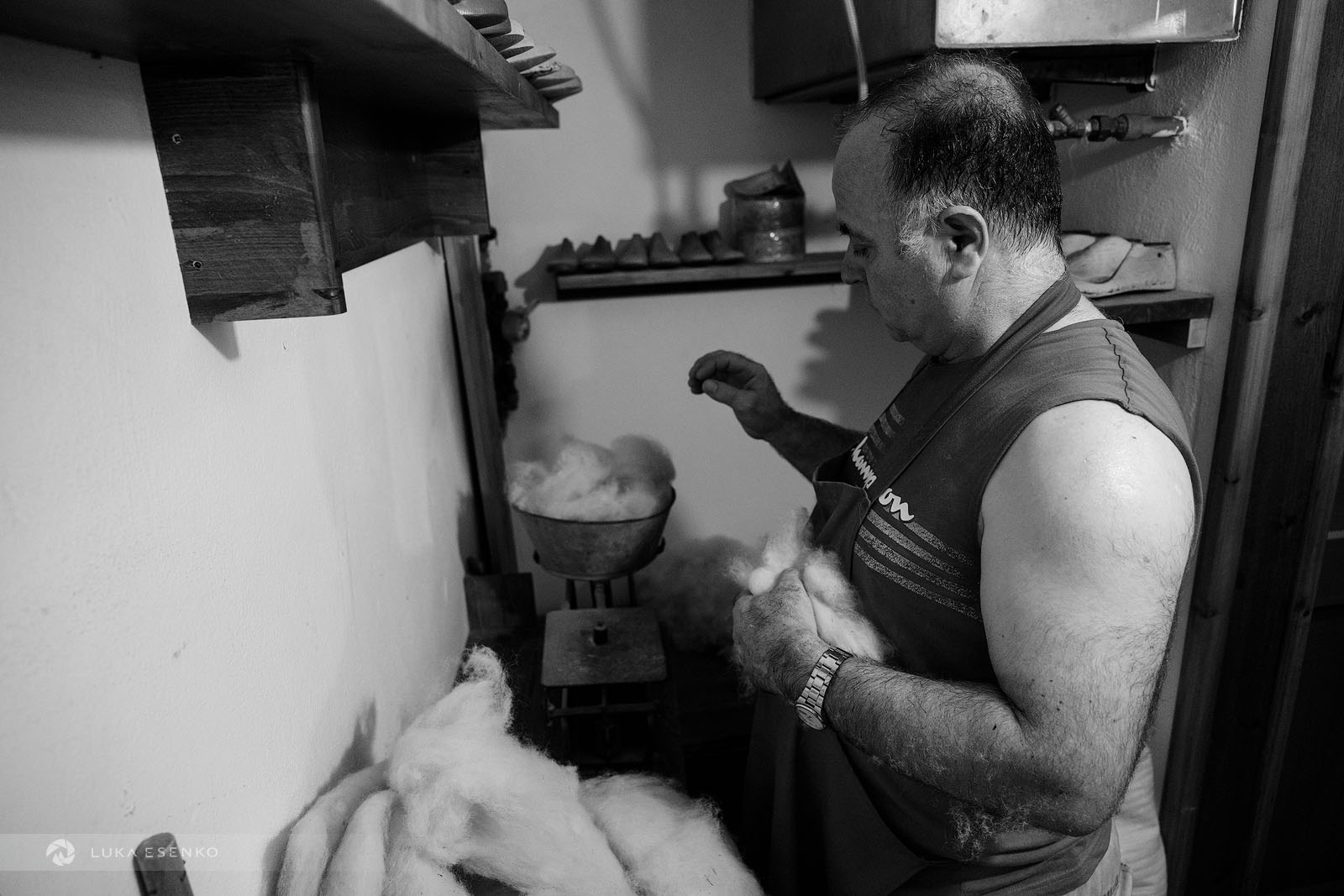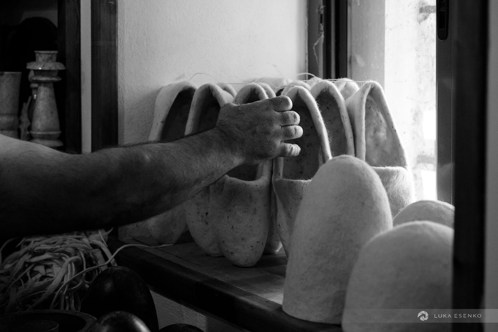 Downstairs, Ndriçim was skillfully processing wool with his specialty bow and wooden hammer. I quietly observed him for a while before he paused and asked where I was from. “Slovenia,” I replied, adding, “Amazing workshop! This seems like hard work.” He nodded in agreement, then glanced at my camera. “Have you seen the signs above?” he asked. “Yes, I did,” I answered. “You can take photos,” he said with a smile. “The signs are for the tourists who don’t respect my craft.” “Faleminderit,” I responded, and began taking photos as he resumed his work. Below is a series of photos that capture the traditional process of making felt hats and slippers. I took these photos over the course of two days to capture the entire process of making the Albanian hat.