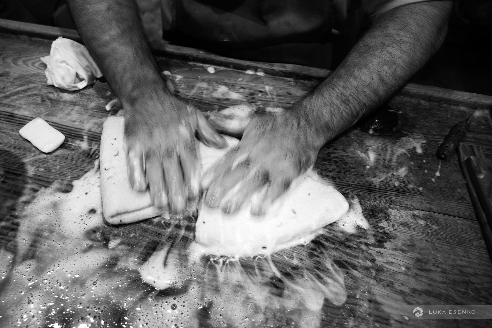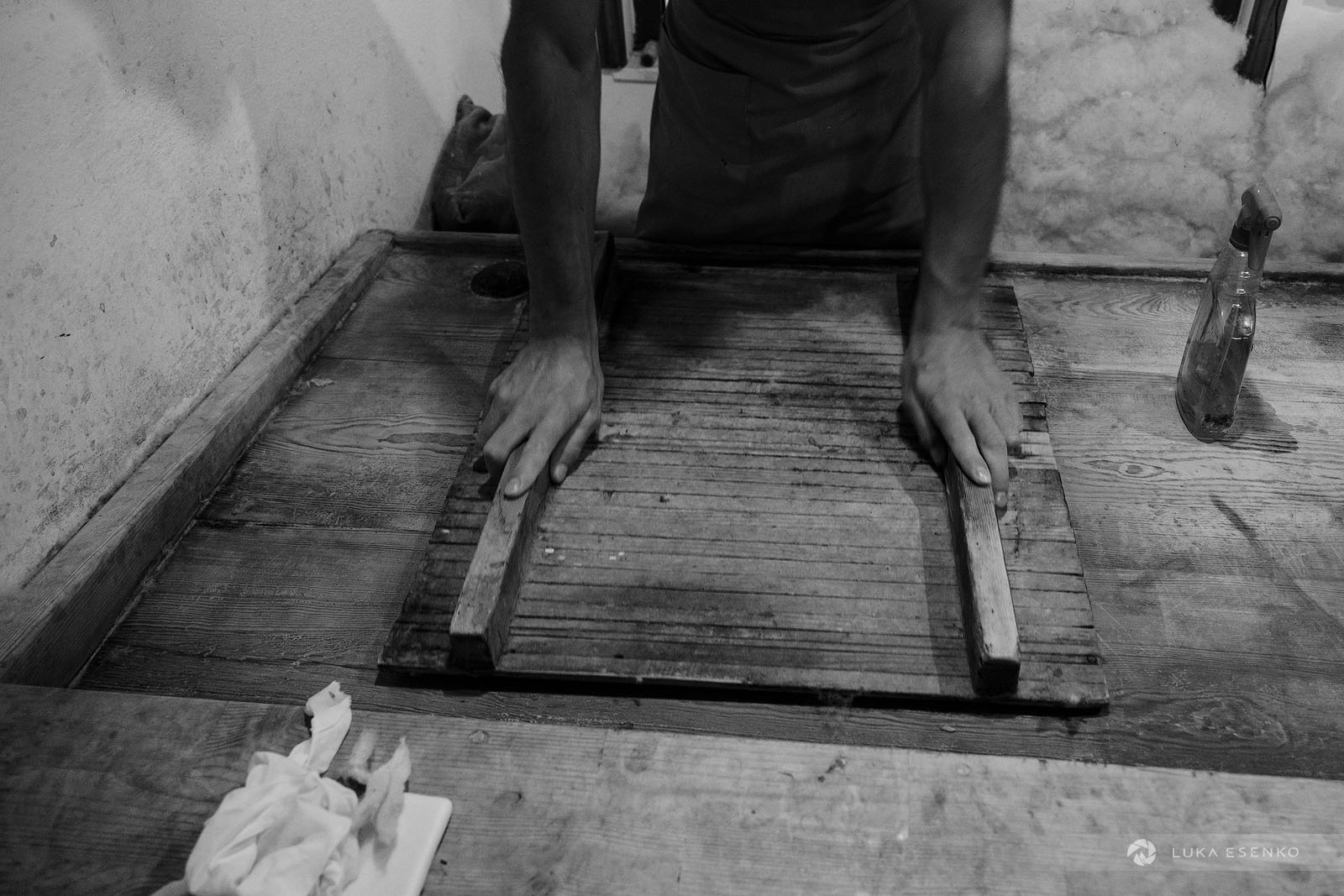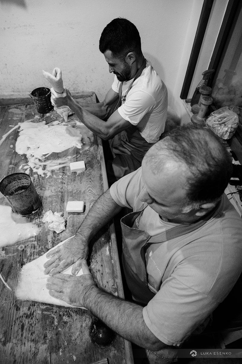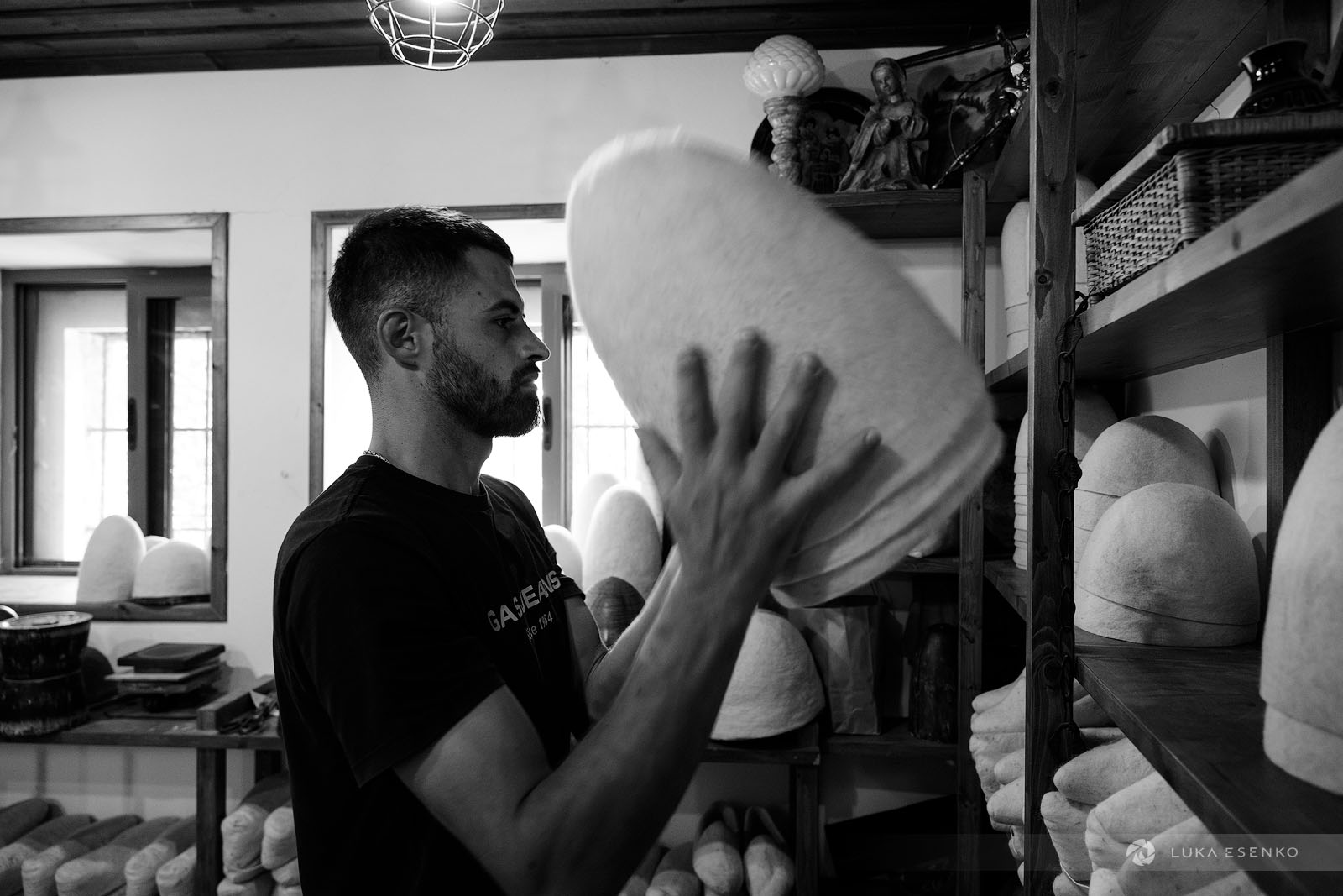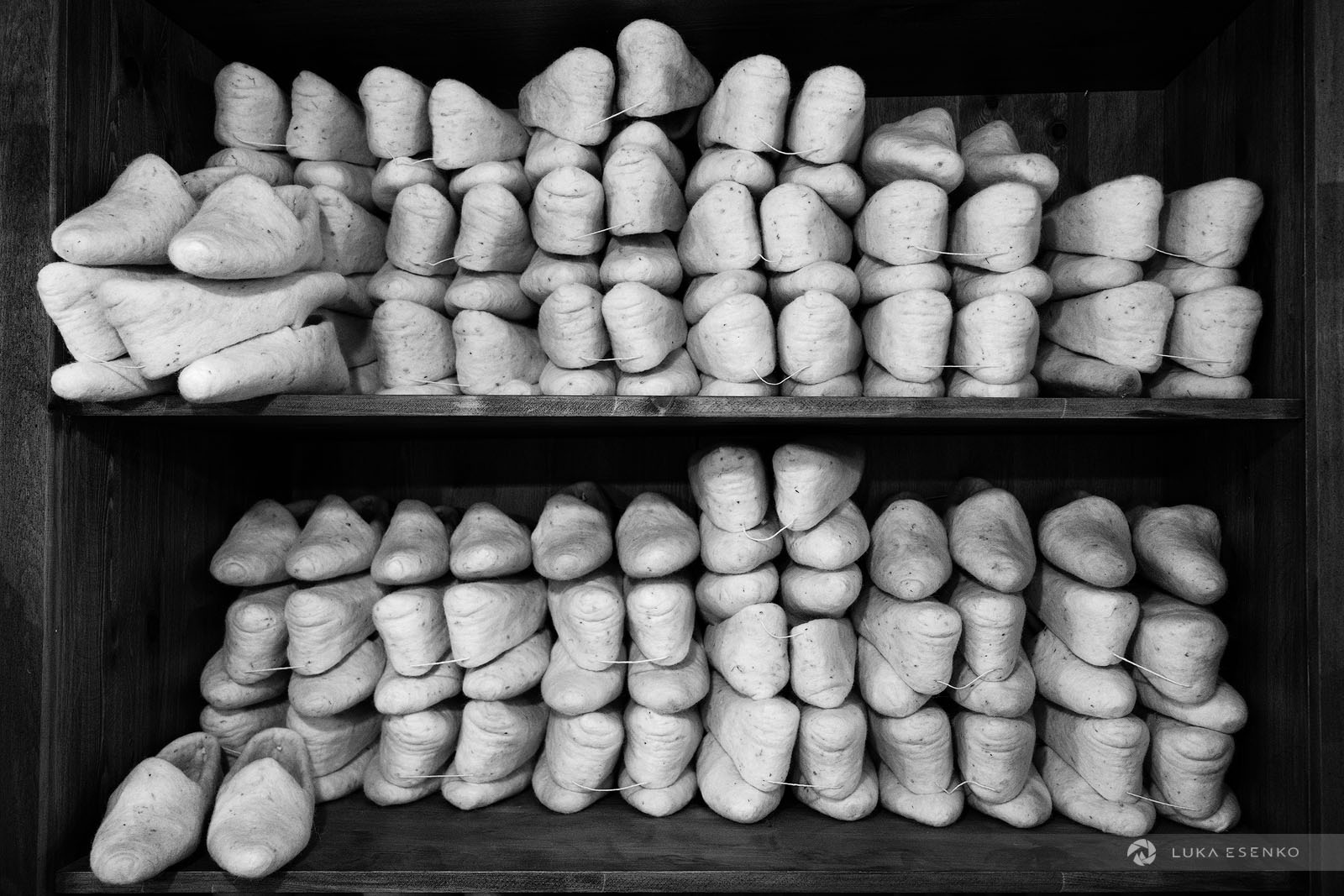 Downstairs, Ndriçim was skillfully processing wool with his specialty bow and wooden hammer. I quietly observed him for a while before he paused and asked where I was from. “Slovenia,” I replied, adding, “Amazing workshop! This seems like hard work.” He nodded in agreement, then glanced at my camera. “Have you seen the signs above?” he asked. “Yes, I did,” I answered. “You can take photos,” he said with a smile. “The signs are for the tourists who don’t respect my craft.” “Faleminderit,” I responded, and began taking photos as he resumed his work. Below is a series of photos that capture the traditional process of making felt hats and slippers. I took these photos over the course of two days to capture the entire process of making the Albanian hat.