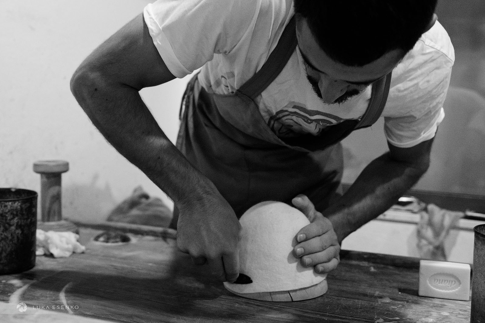 Ndriçim uses his bow and a wooden hammer to separate and loosen the wool fibers. He then forms loose balls of wool, each sized to fit a single hat or slipper. Ardian takes these balls and transfers them to his work table, where he compresses them into thin, pizza-shaped sheets. These are then pressed under weights overnight to make them even thinner.