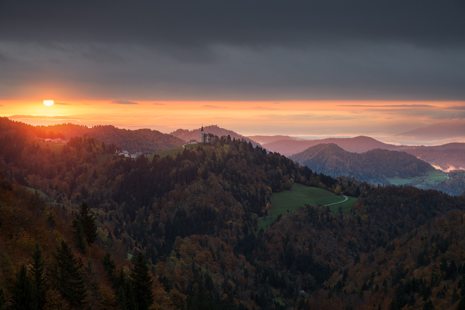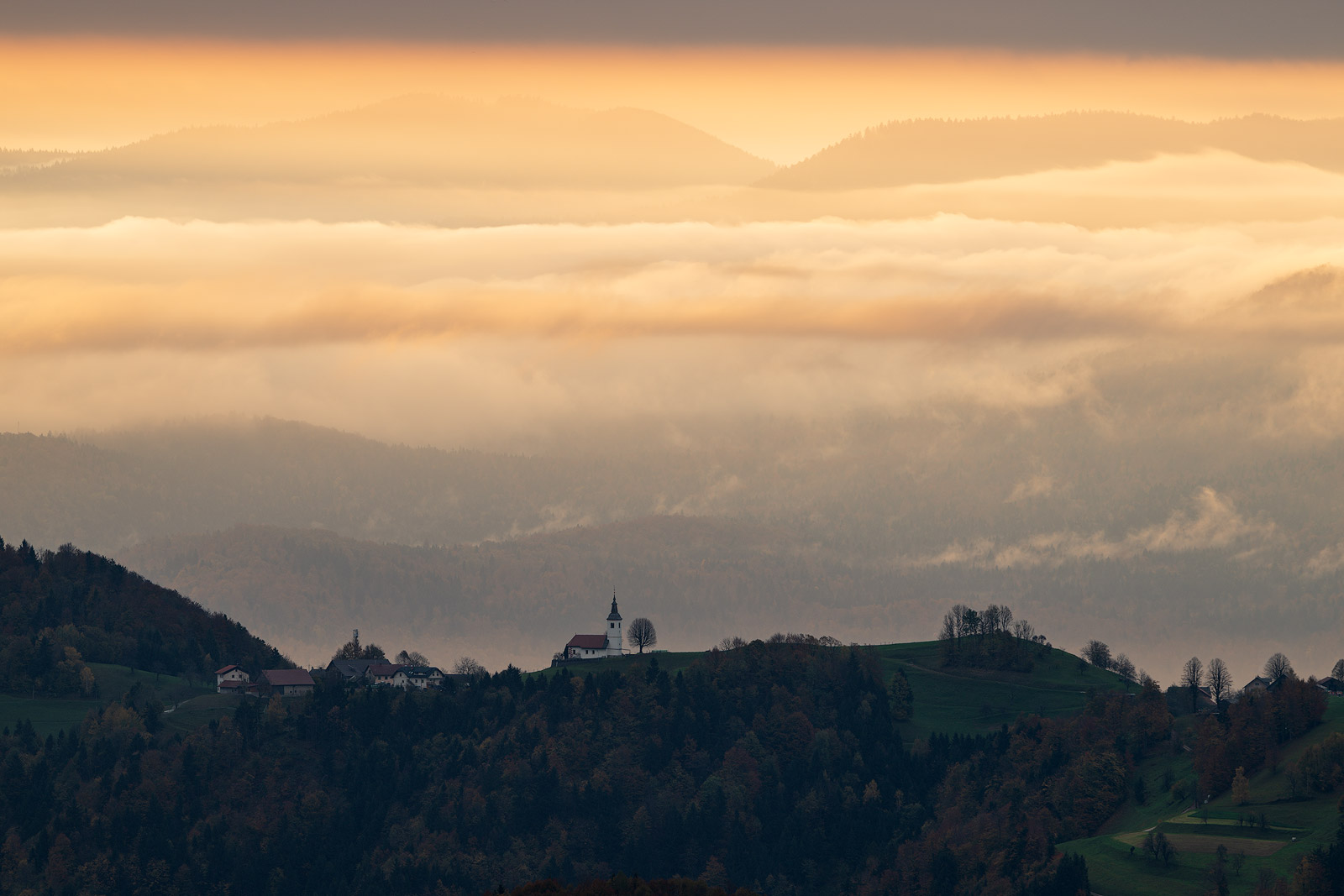 Still buzzing from the previous evening, I headed out early the next morning. My plan was to photograph around Škofja Loka, but the fog was far too thick, so I changed course and drove toward Polhov Gradec instead. On the way, a completely new view stopped me in my tracks: the church of Sveti Lenart (St Leonard) at Črni Vrh, glowing like a beacon against the dark, rolling hills.