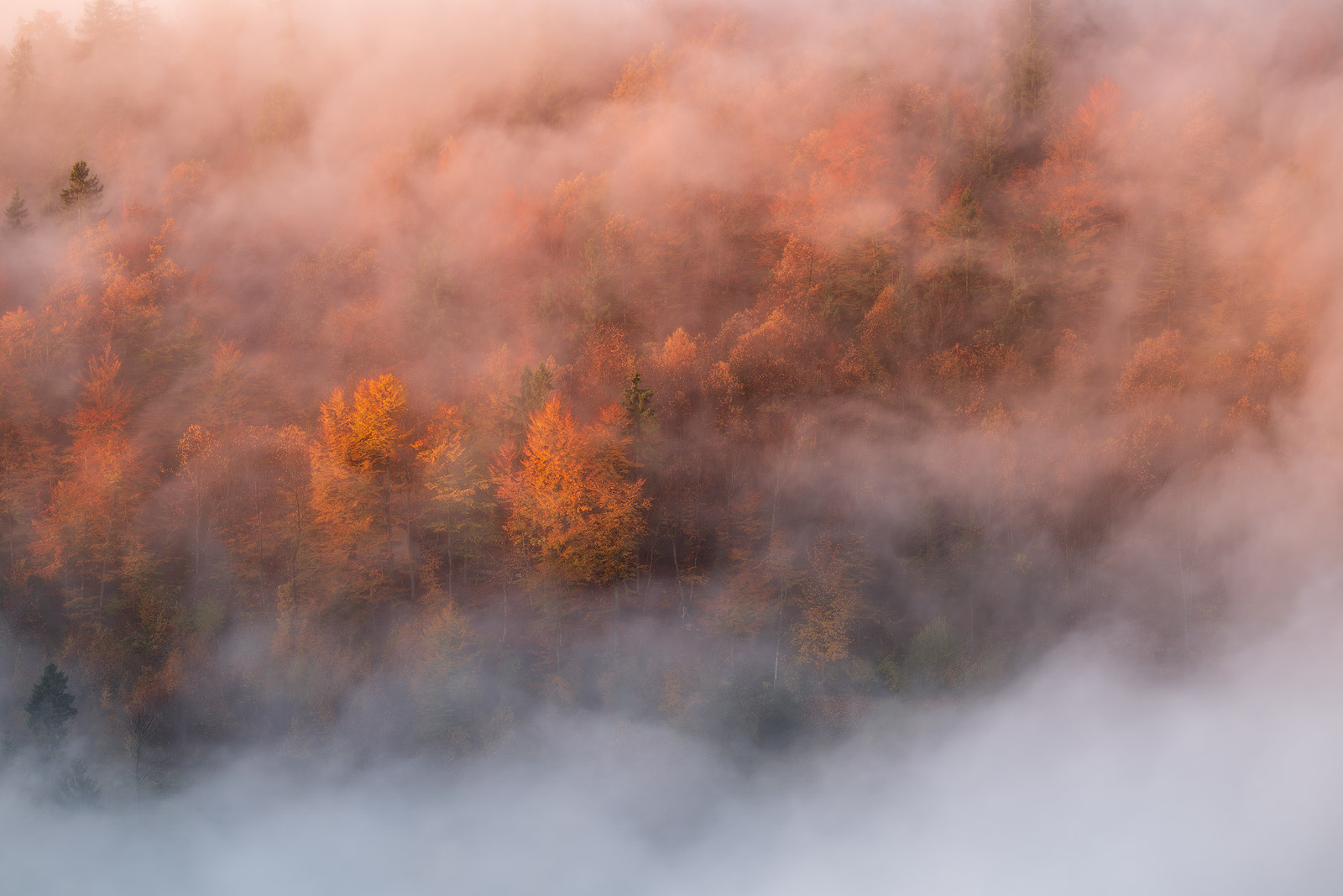 The wide views were beautiful, but the images I loved most weren’t the grand landscapes at all. What really caught my eye were the quieter, more intimate scenes: trees dissolving into the fog, forested slopes fading into layered greys, and those minimal, almost abstract moments you only get on mornings like this.