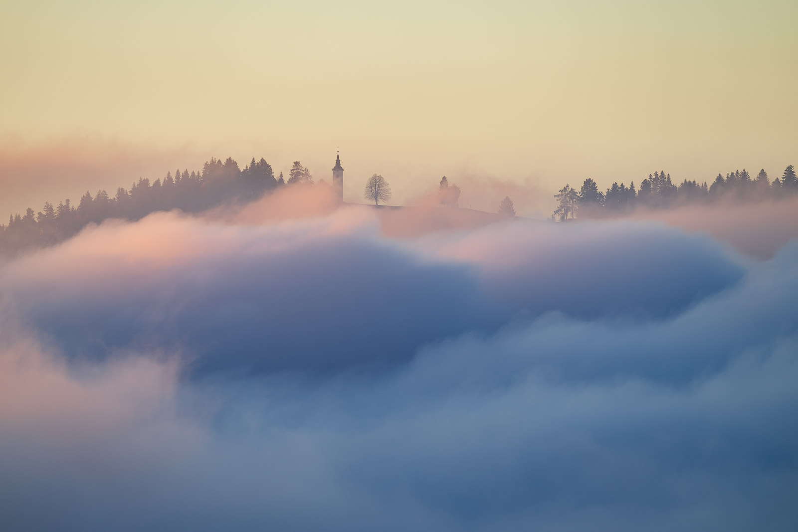 My last outing was another sunrise mission. I headed back toward Škofja Loka, hoping the fog would finally play along. I didn’t end up anywhere I had planned — instead, I found myself in a completely different spot, perched just above the fog line with the landscape drifting in and out of a soft, glowing sea of mist.