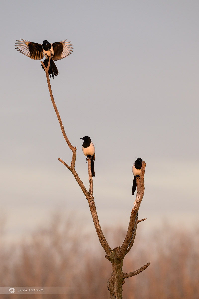 As daylight broke, the first birds appeared—magpies and crows. Shortly after, common buzzards began arriving. We watched in awe as they fed and squabbled, perching on the ground and nearby trees. The first eagle of the day, an Eastern imperial eagle, made a cautious approach. It took several attempts before it finally gathered the courage to feed.