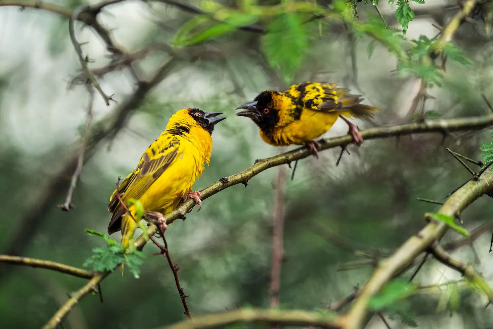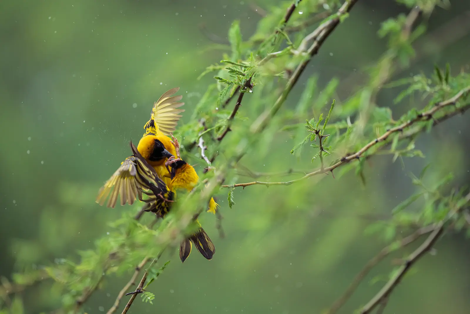 The next morning, we were having breakfast on the terrace. Coffee in hand. Soft light after the rain. Suddenly, we heard intense bird chatter. We looked up — and there they were. The black-headed weavers had returned. Hundreds of them. The tree that had been silent the day before was now bursting with life. Birds were building and repairing nests, fighting each other, carrying fresh grass, or grooming their wet feathers from the night’s rain.