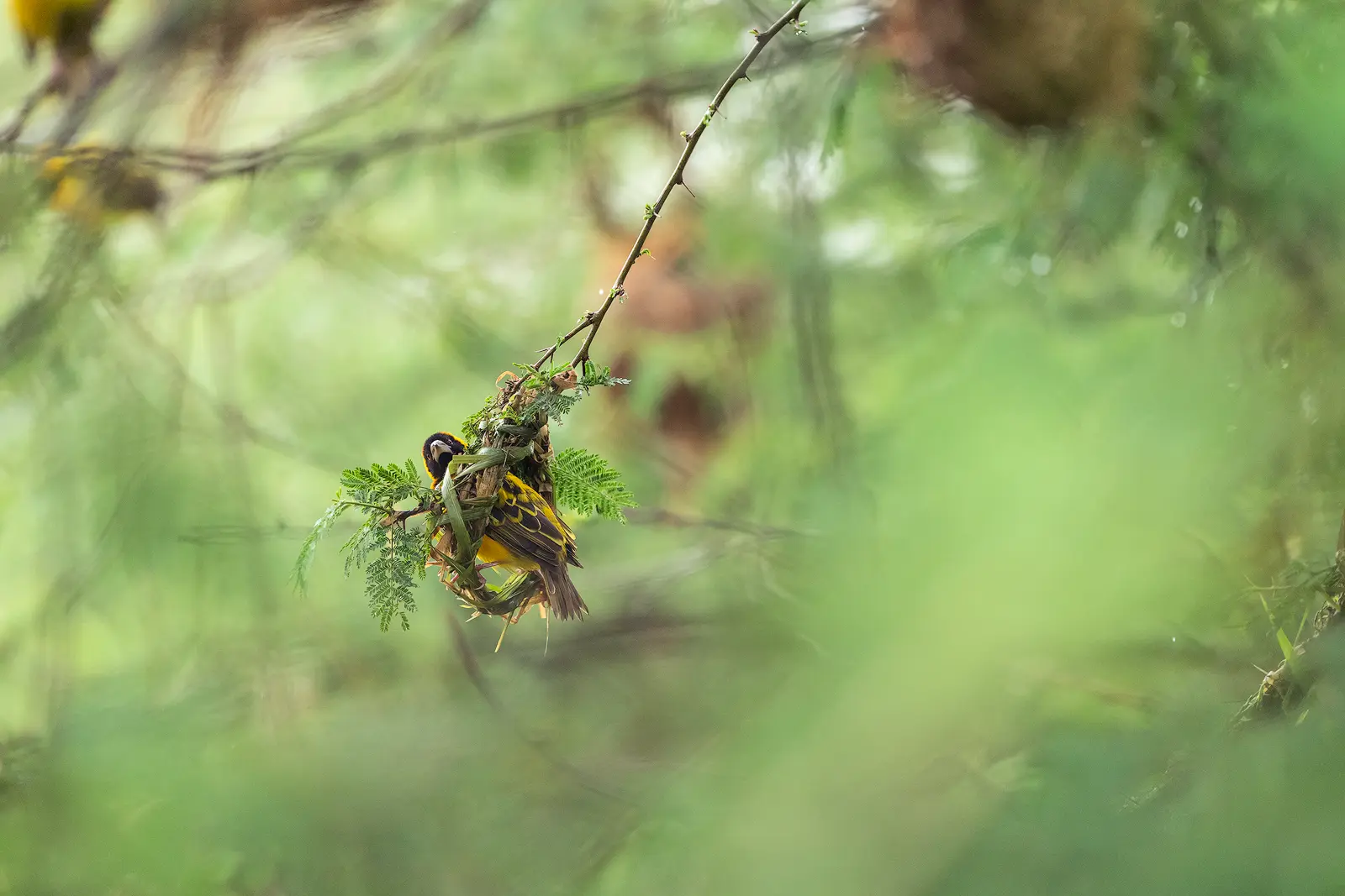 I was leading a photography tour to Uganda, and we were staying at Embogo Lodge, in the Ishasha sector of Queen Elizabeth National Park. When we arrived, there was a tree full of empty black-headed weaver nests. Dozens of them hang from the branches. They were beautifully woven, perfectly shaped — and completely empty.