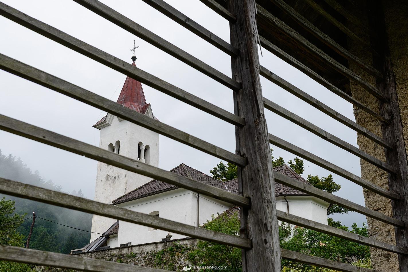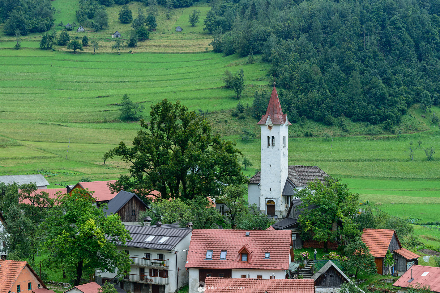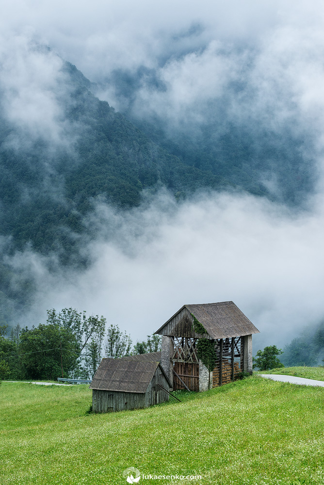 Rut, Slovenia. A tiny village on the southern slopes of the Bohinj mountains. It features a typical architecture that goes back centuries. There are still well-preserved farmhouses, a church of St Lambert, and a few beautiful hayracks that are still in use. When you arrive in the village, it seems time has stopped.